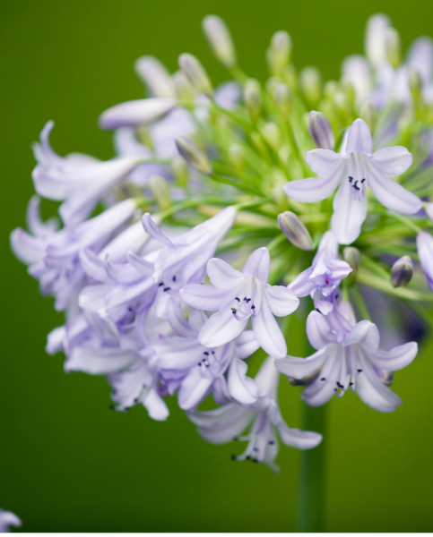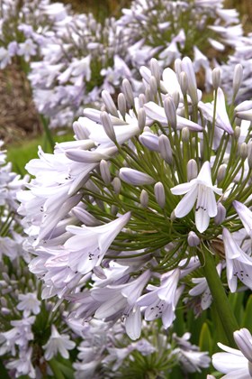 Agapanthus 'Windsor Grey' (Lily of the Nile) is a fantastic variety with the large heads of lavender-grey flowers having grey anthers and green pollen, with the flowers fading with a slight bit of pink. The strap-shaped, arching leaves are deep green, forming a basal clump. From July to September, rounded umbels of tubular flowers rise on tall stems above the clump, palest lavender-grey, with green pollen and green at the base of each flower. The flowers are attractive to pollinators. Very good in containers, especially in a formal row of identical pots. Agapanthus Windsor Grey is one of the hardier agapanthuses, but will benefit from a winter mulch in the coldest areas.