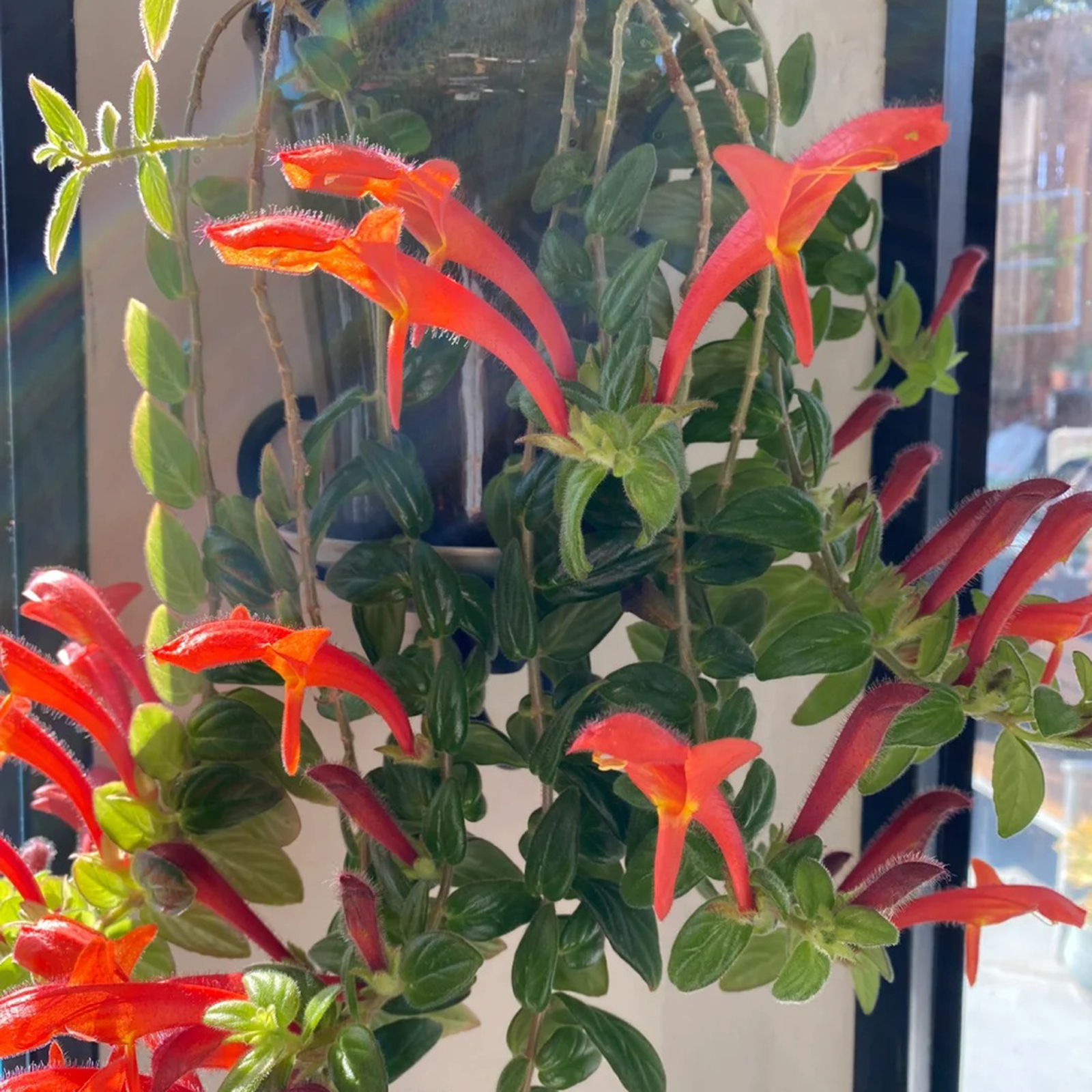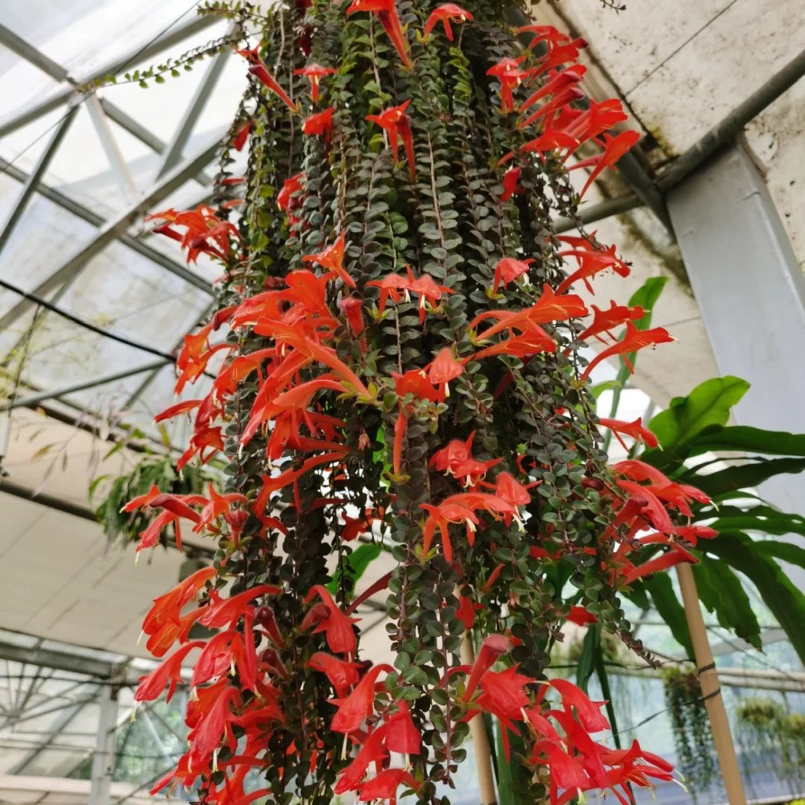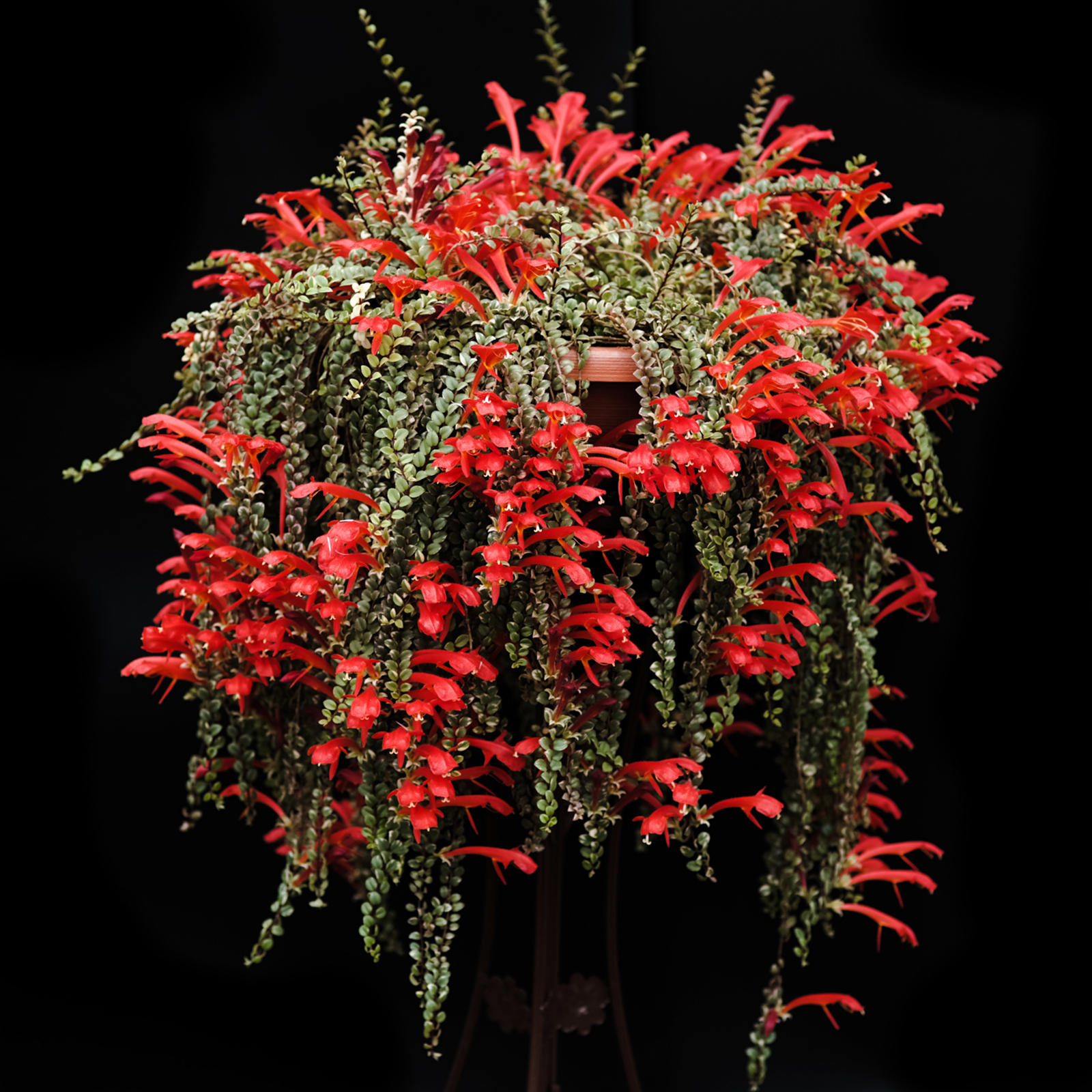 Blue whales swim in the sea, red whales swim in the air! Columnea "Broget Stavanger" is a rare species of hanging orchid, it is a perennial evergreen vine, its stems and branches are slender and soft drooping, easy to produce branches. Flowers are solitary, long tubular lip-shaped flowers resembling whales, and bloom throughout the year at suitable temperatures. Leaf blade and corolla with fluffy, unique flower shape, like a whale swimming in the sea.
