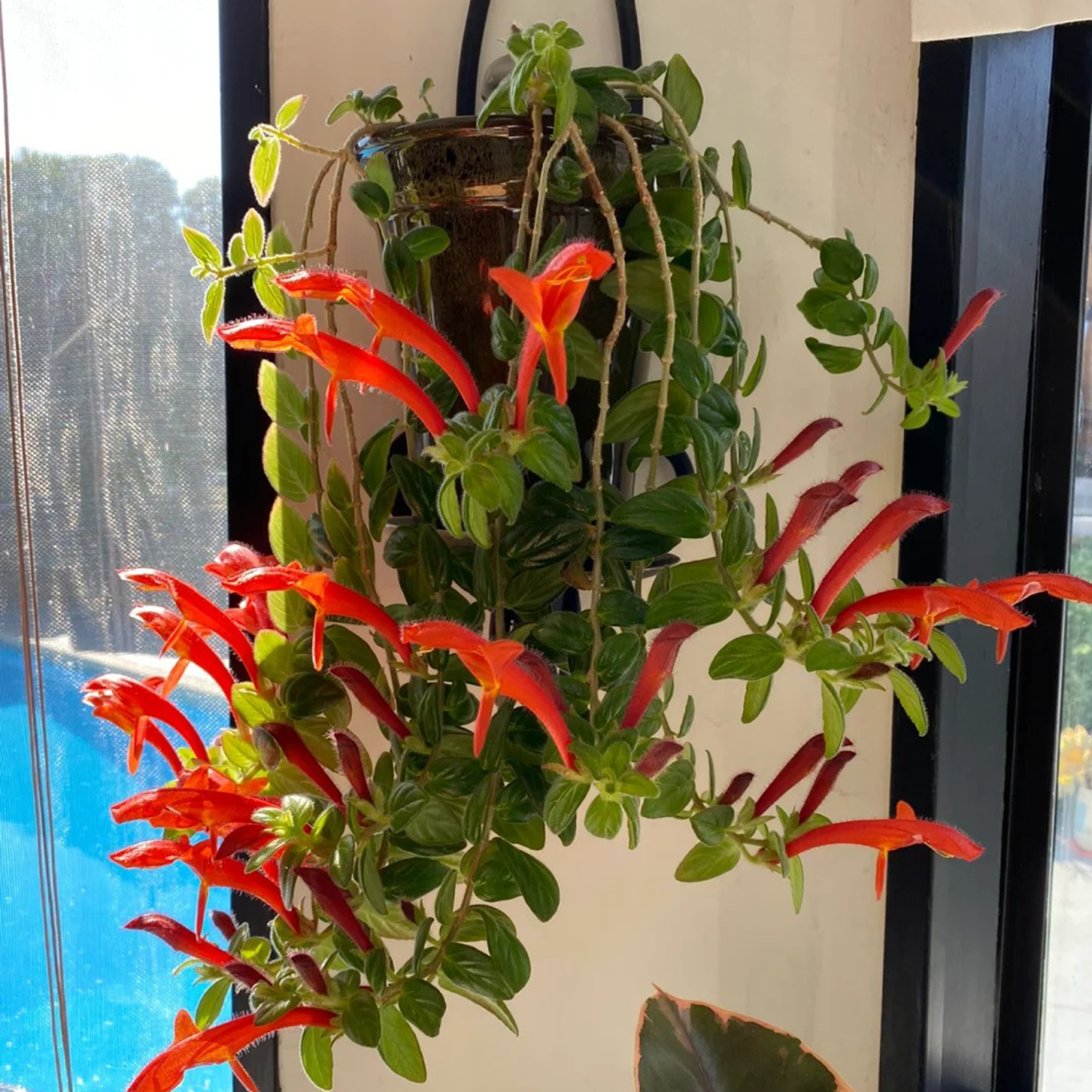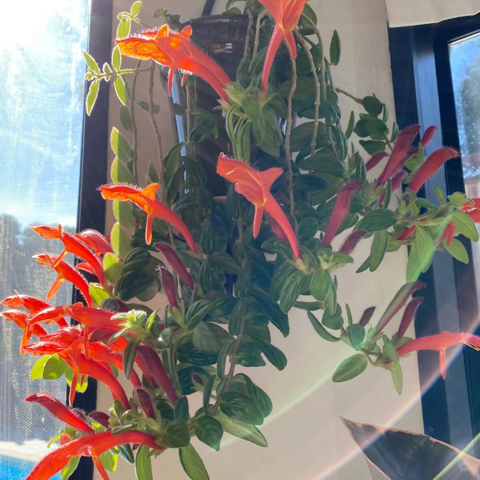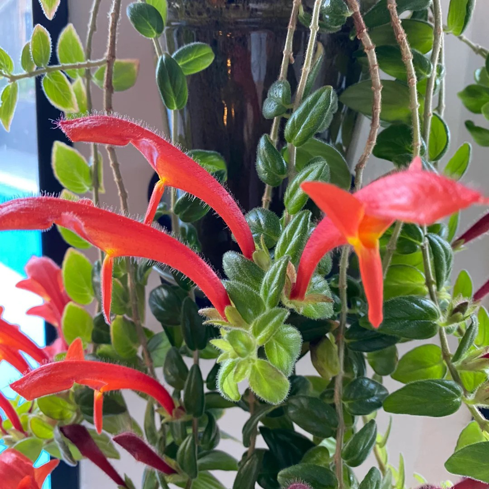 Blue whales swim in the sea, red whales swim in the air! Columnea "Broget Stavanger" is a rare species of hanging orchid, it is a perennial evergreen vine, its stems and branches are slender and soft drooping, easy to produce branches. Flowers are solitary, long tubular lip-shaped flowers resembling whales, and bloom throughout the year at suitable temperatures. Leaf blade and corolla with fluffy, unique flower shape, like a whale swimming in the sea.
