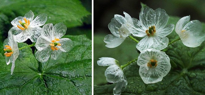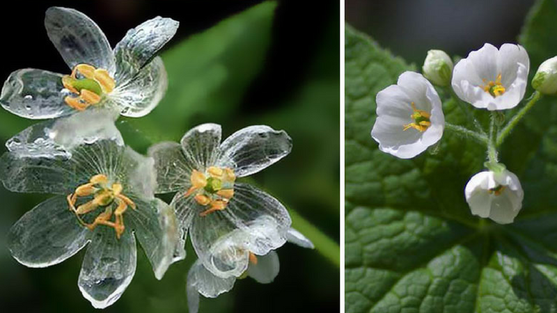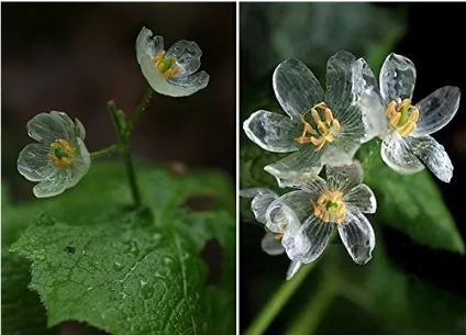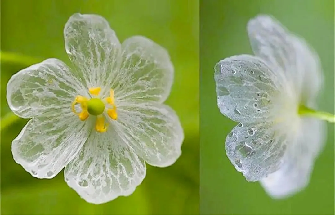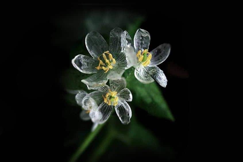 These spring-blooming flowers turn translucent when wet due to their loose cell structure. When they come in contact with a steady supply of water for a little while, the water droplets stick to the exposed veiny structure, filling up the lattices and causing increased light reflection. The flower would then take on the crystal clear appearance of water, turning completely translucent.