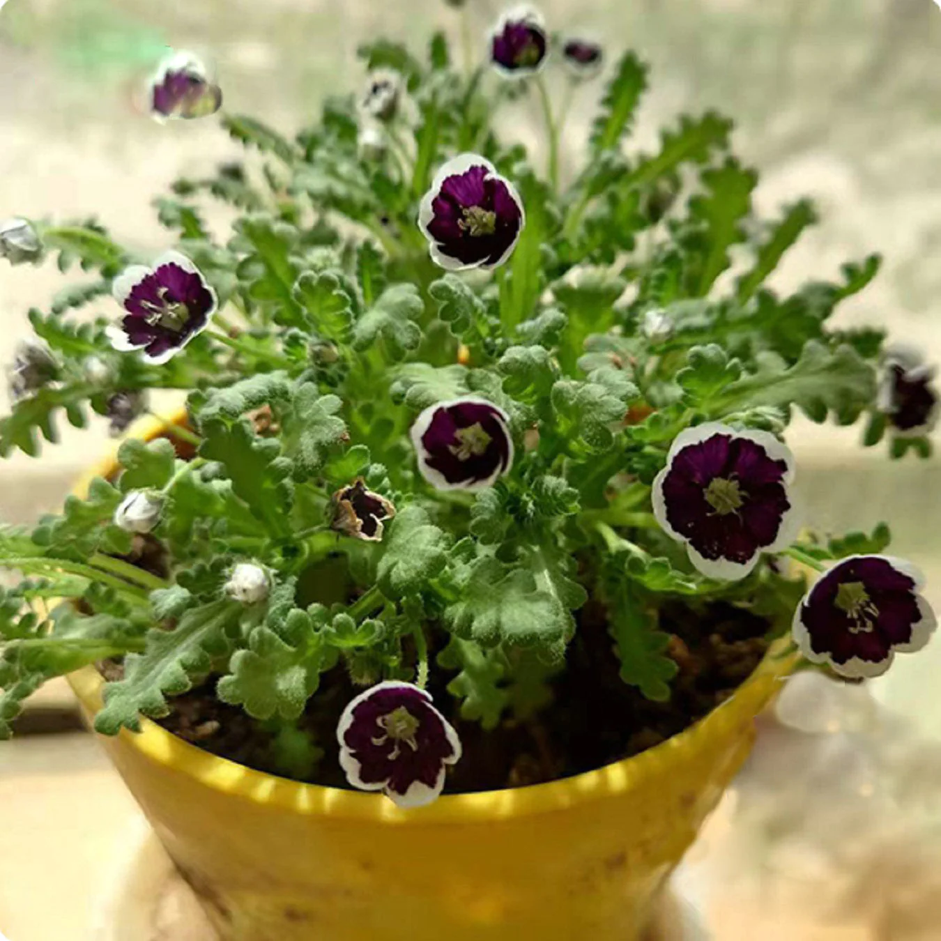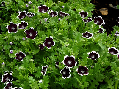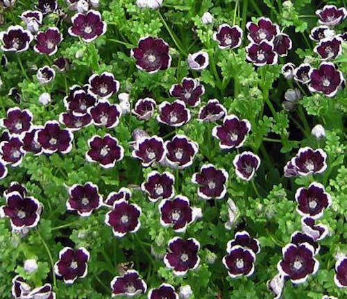 Pennie Black (Nemophila Discoidalis) - Start Pennie Black seeds for this lovely low-growing annual that has a trailing habit. Nemophila Pennie Black, also known as Nemophila Baby Black Eyes, is a superb, easy to grow annual with masses of small, 1 inch deep violet to black flowers that are edged with white. The Victorians loved this tiny two-toned flower with light, airy foliage. The Nemophila Penny Black plant only reaches 4 inches in height and is slightly trailing, so it is perfect for containers, baskets, and window boxes, or use it as an edging for borders or a ground cover plant.