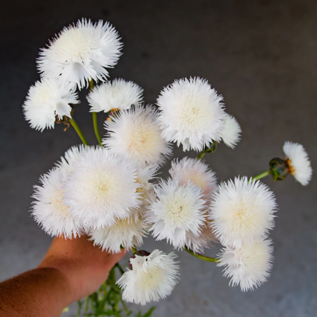 Sweet Sultan 'The Bride' will literally take your breath away. This is an absolutely exquisite flower of the fluffiest, pure white and creamy tones. It makes a glorious summer display in the garden and the gorgeous, large ,pure white, sweety fragrant fluffy blooms all summer til frost are on tall wiry straight stems, perfect for cut flower arrangements. These elegant beauties are very long lasting,Excellent for specialty summer cutflower, field grown or under hoops. Also good subject for mass summer landscaping. both in the garden and as a cut flower.  So divine!