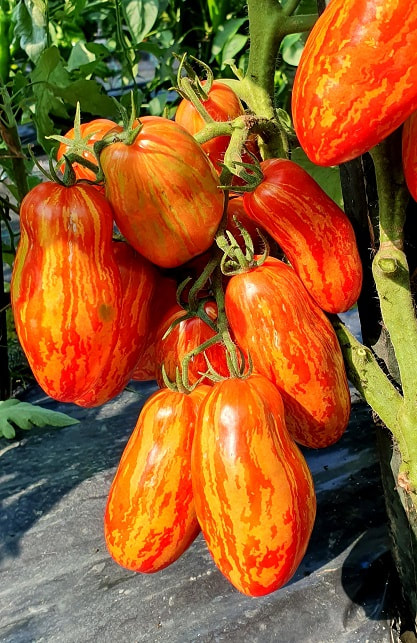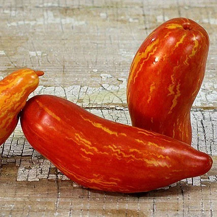 Unique! These long, roma-shaped tomatoes have orange stripes running down the length of the fruit. Tomatoes are very thick and meaty with a nice rich flavor.