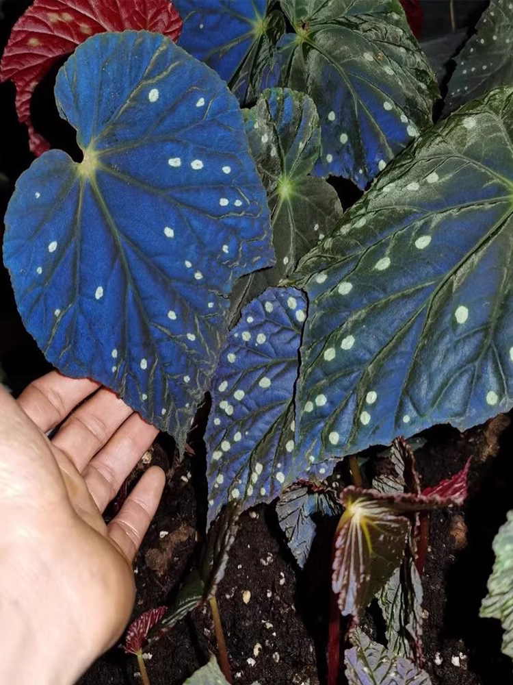 The new leaves are red, while the old leaves are dark green on the front and red on the back, reflecting light, so they will be blue-purple under low light