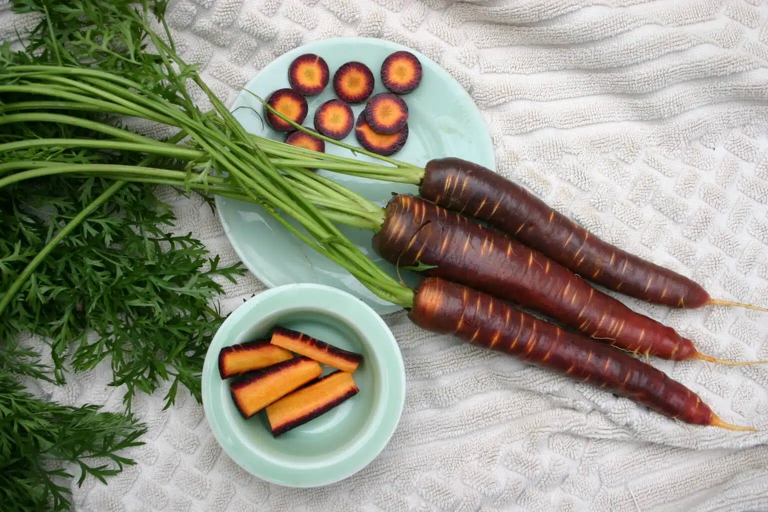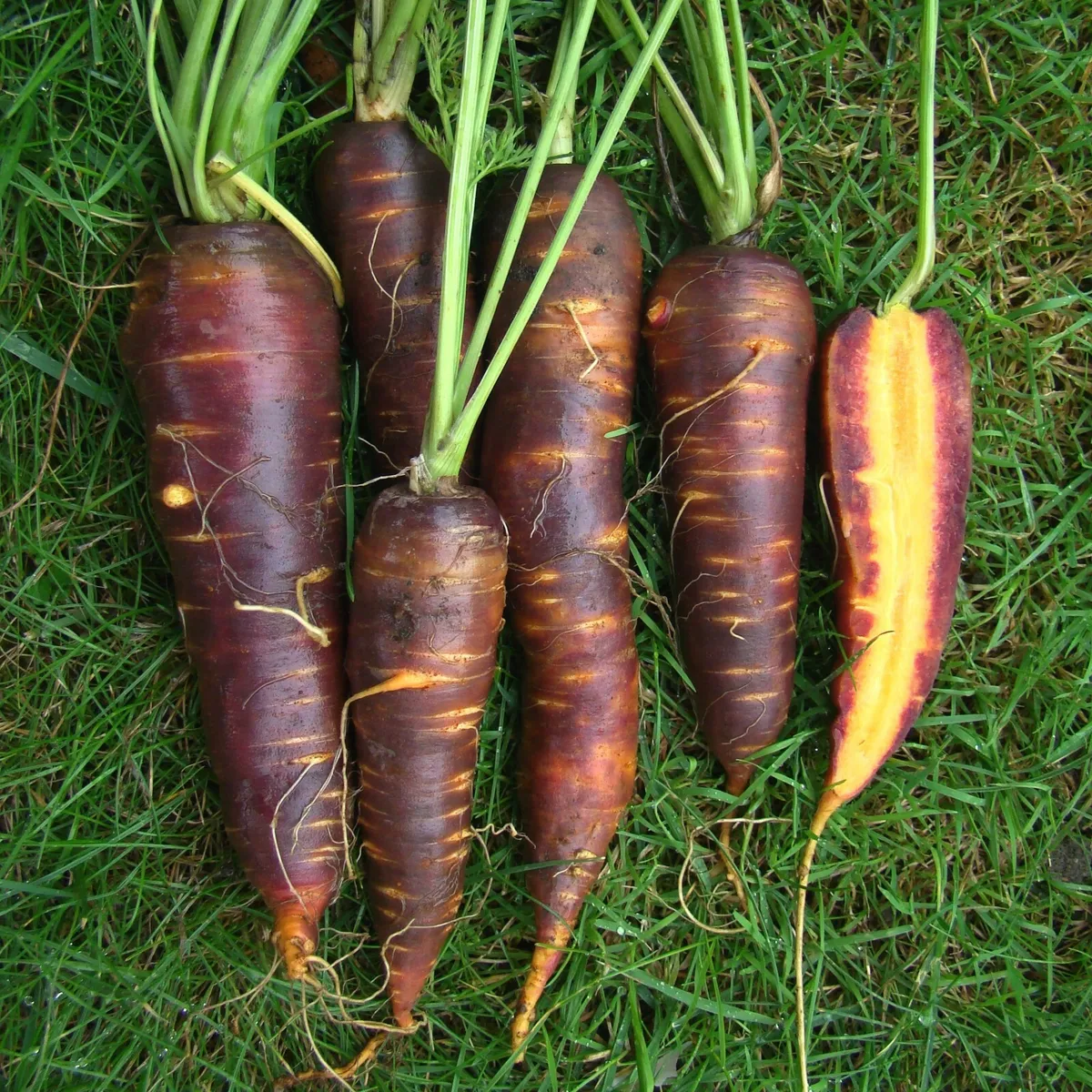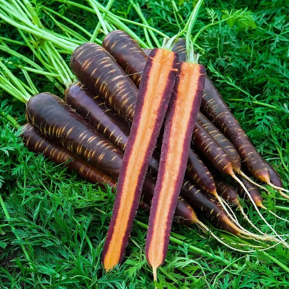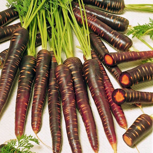 A vigorous variety with purple skin and a bright orange interior. The long smooth 25-30 cm purple roots that tapers to a point are sweet and high in vitamin A content. Ideal eaten raw and just as tasty cooked although the colour does bleed when cooked.