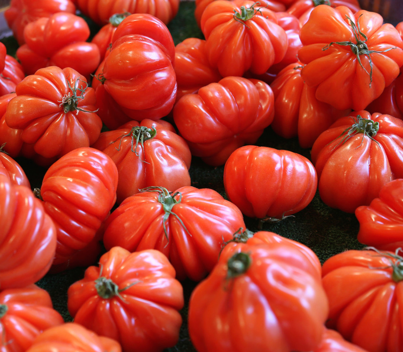 A unique show tomato. Our tomato fest organic tomato seeds produce big, sprawling, regular-leaf tomato plants that provide an average yield of beautiful, 1 pound, dark-pink tomatoes that are very fluted or ruffled like an accordion. Tomato lovers consistently rave about this beautiful tomato. A perfect choice for a commercial market tomato because of its popularity. The tomato is slightly hollow making it a good stuffing tomato. Flavors are mild and sweet. A low-acid tomato with few seeds.