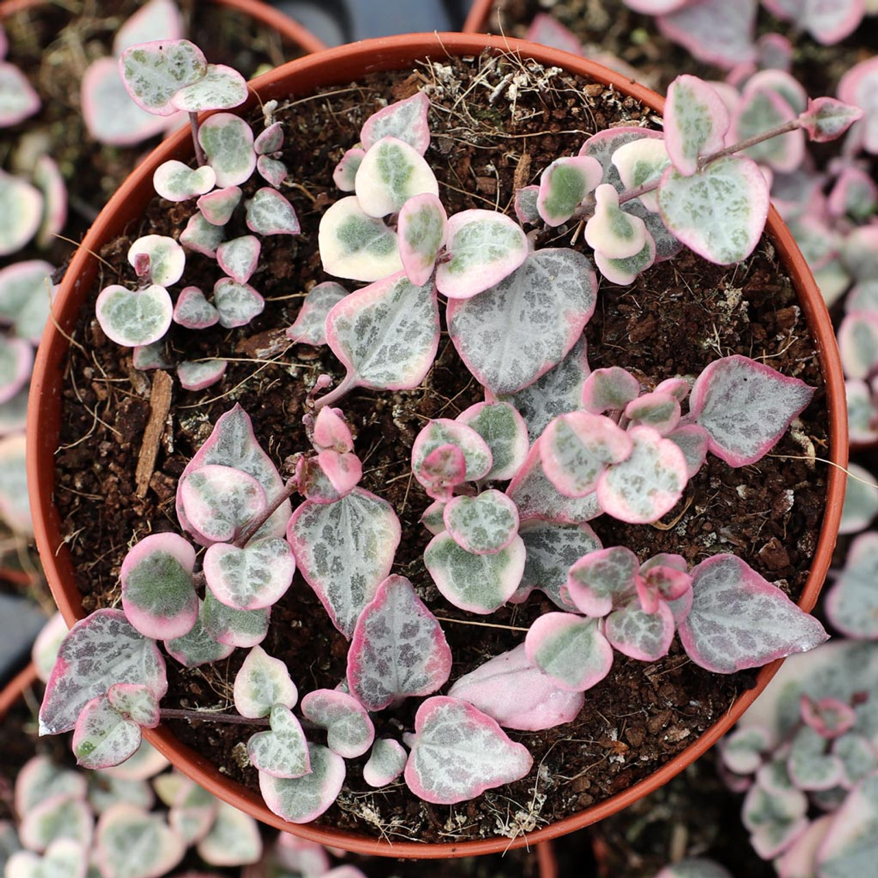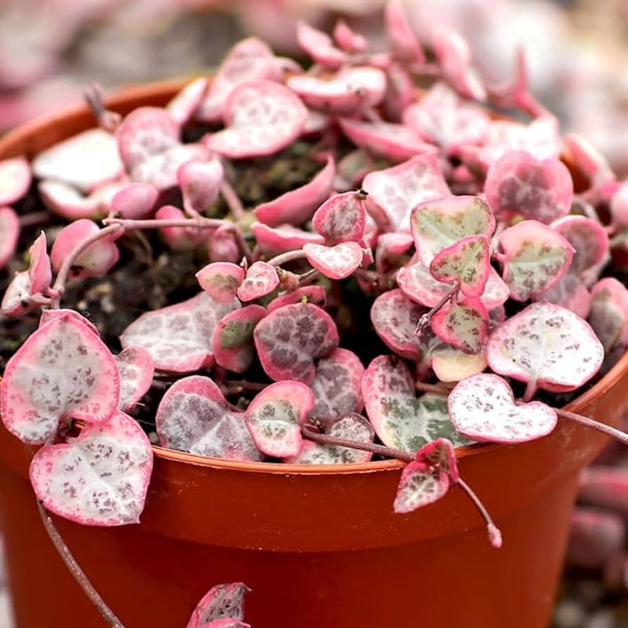 This is a highly sought after plant. It has grown lovely in our 2" or 4" containers. Has lovely pink-white-green leaves. Its plump leaves are shaped just like little hearts, deep green in color lined with bright light blue. The new grown and stems are often tinged pink. The leaves appear on long cascading vines that hang straight down, creating an effect almost like a beaded curtain of heart-shaped leaves.